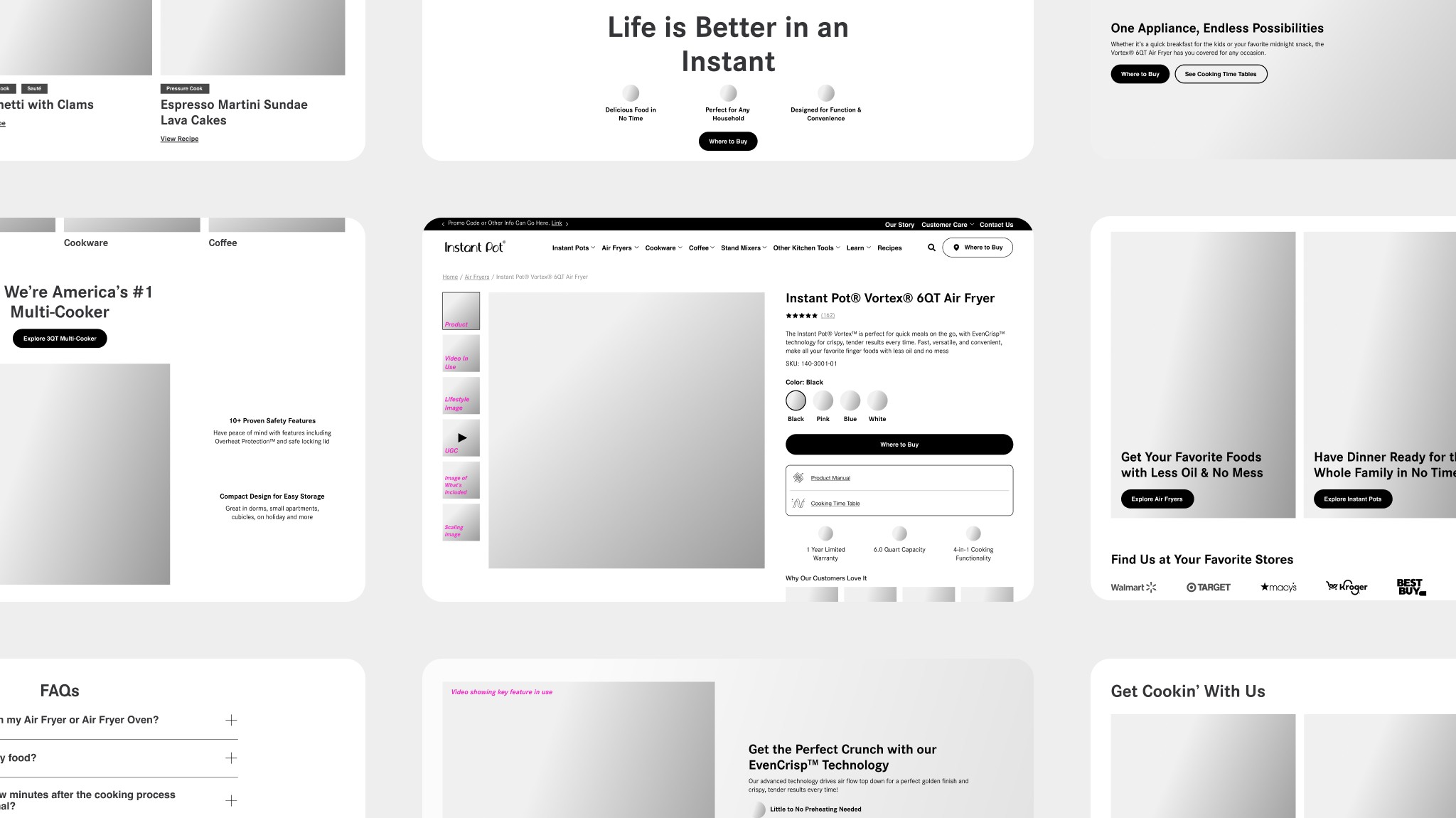 To start the project and determine key touchpoints for the foundation of the brand story across the site, we mapped out wireframes for the homepage and product pages. Since product discovery was a key goal, we explored two navigation approaches to guide users through Instant Pot’s content.